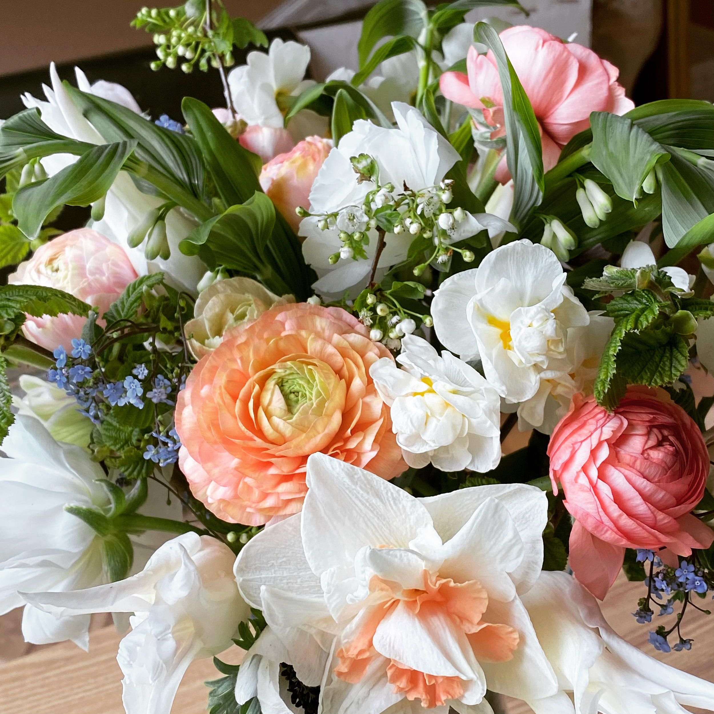 A bouquet of seasonal flowers fresh from the field, including some complementary foliage.